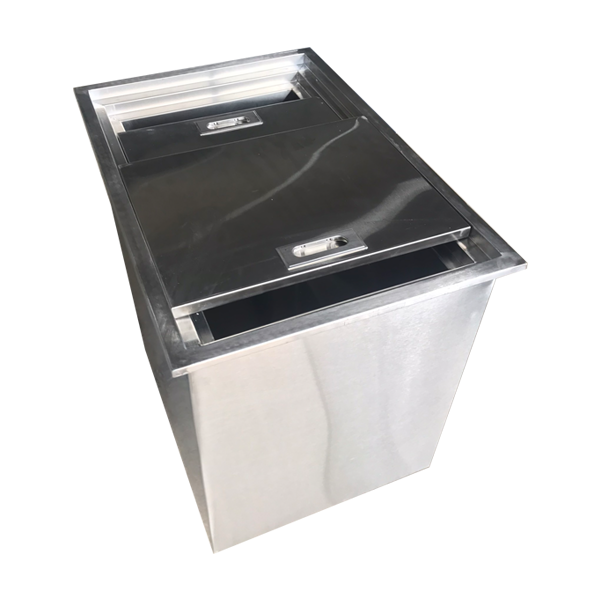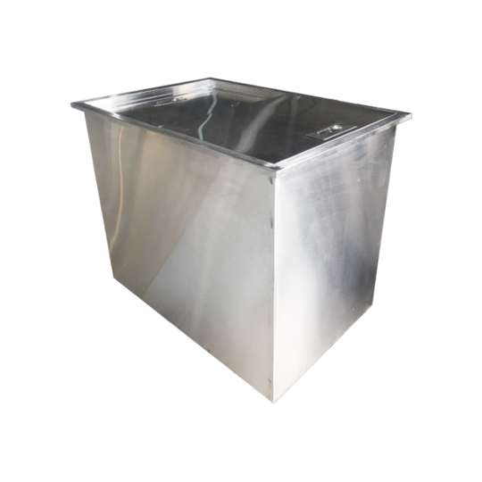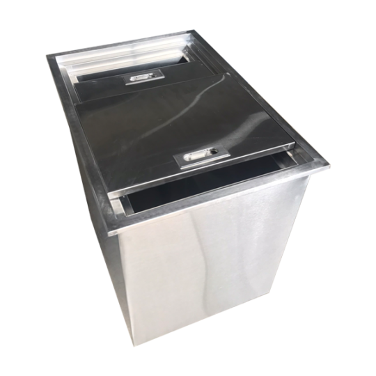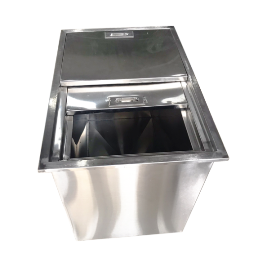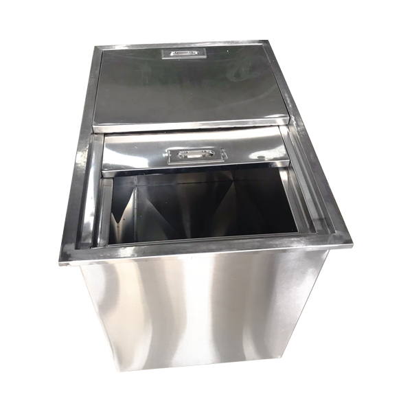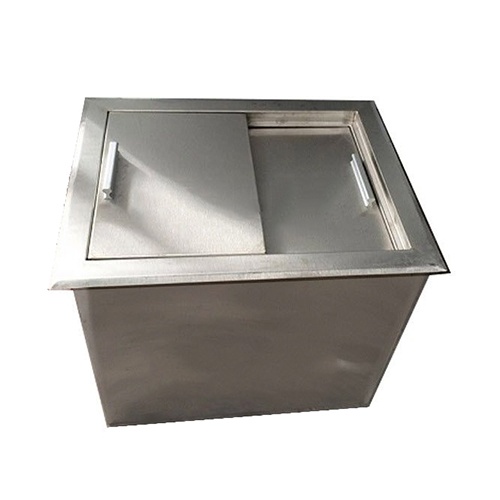 - Thùng đá âm bàn inox thiết kế vuông hiện đại, bề mặt inox cao cấp sáng bóng, tạo vẻ ngoài gọn gàng và sang trọng.